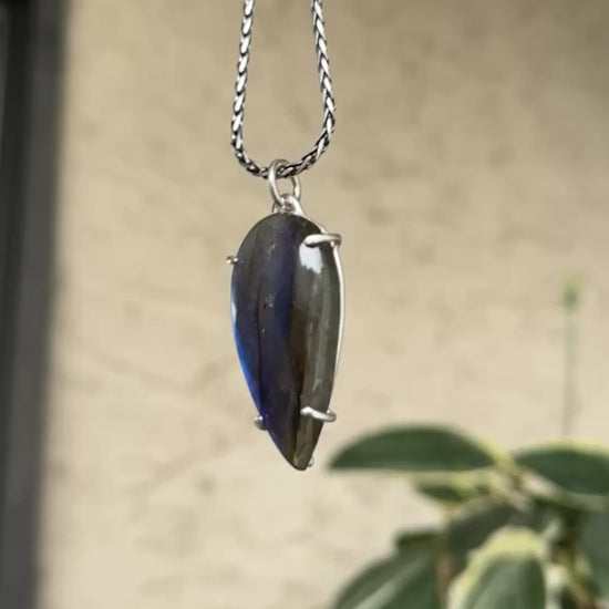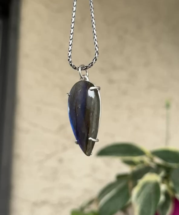 This pendant showcases a teardrop shaped 38x18mm high-quality blue flame labradorite set in an argentium silver frame. Made from a newer sterling silver alloy enhanced with germanium, it offers lasting tarnish resistance. The total length including the bail is 46mm. Please note, the chain is not included.