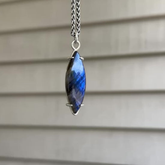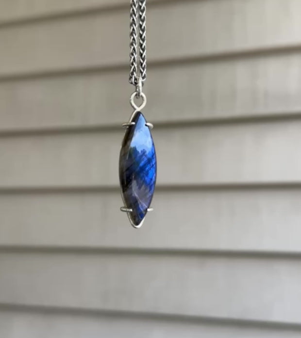 This pendant features a 36x12 mm blue flame labradorite, measuring 47 mm in total with the bail. Set in an argentium silver frame. Argentium is a contemporary sterling silver alloy enhanced with germanium for better resistance to tarnishing. Please note, the chain is not included.
