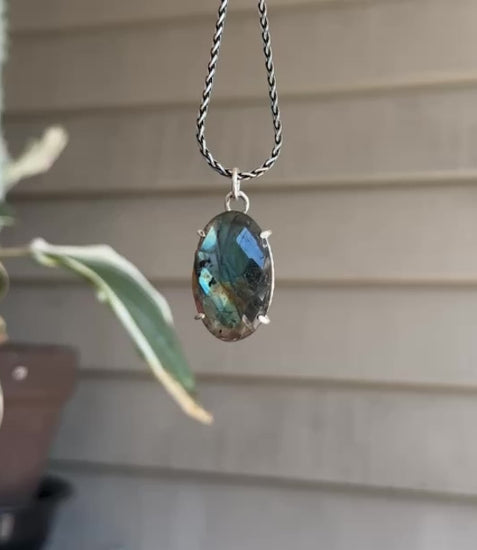 Capture the mystique of moonlight with this faceted labradorite pendant, showcasing a 29x18mm dark stone that dazzles with a strong flash of color. Measuring 39mm in total height including the bail, it is beautifully set in an argentium silver frame. Argentium silver’s innovative alloy, enriched with germanium, offers lasting shine and remarkable tarnish resistance, ensuring this piece stays luminous wear after wear. Please note that chain is not included.