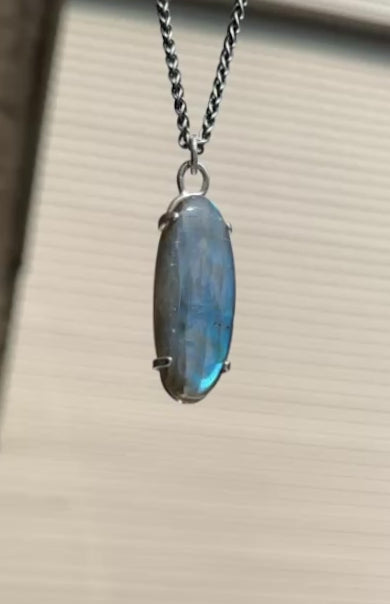 This Labradorite pendant features a stunning 37x15 mm elongated oval stone, set in a durable argentium silver frame. Argentium silver is an advanced sterling silver alloy with added germanium, providing greater resistance to tarnish and ensuring lasting shine. This elegant piece highlights the beautiful blue flashes of labradorite, making it a versatile accessory for everyday wear. Please note, the chain is not included.