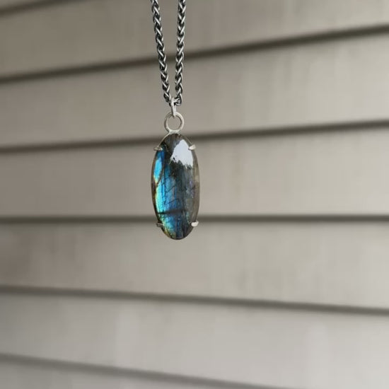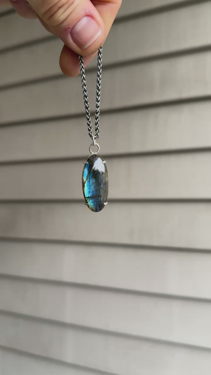 Enhance your jewelry collection with this stunning Labradorite pendant, featuring a vibrant blue 32x15mm stone set in a sleek argentium silver frame. Measuring 43mm in total height including the bail. Crafted from argentium silver, a modern sterling alloy infused with germanium, it offers superior tarnish resistance to keep your pendant shining bright. Chain not included.