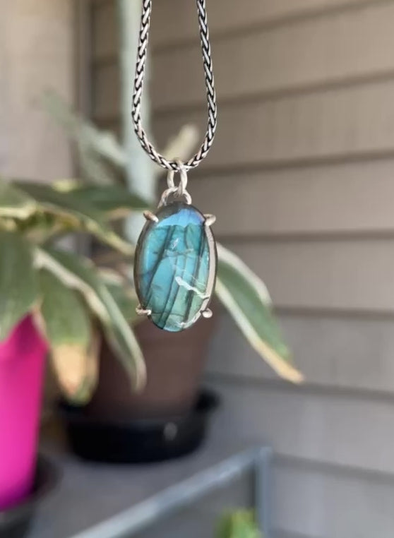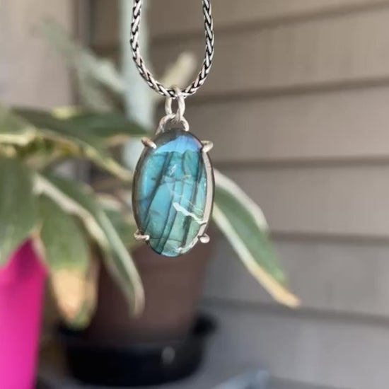 This pendant features a striking 27x18 mm labradorite set in an Argentium silver frame, a modern sterling silver alloy infused with germanium for enhanced tarnish resistance. Please note, the chain is not included.