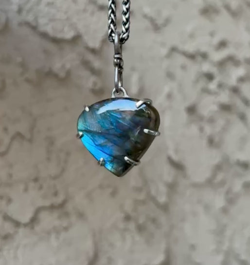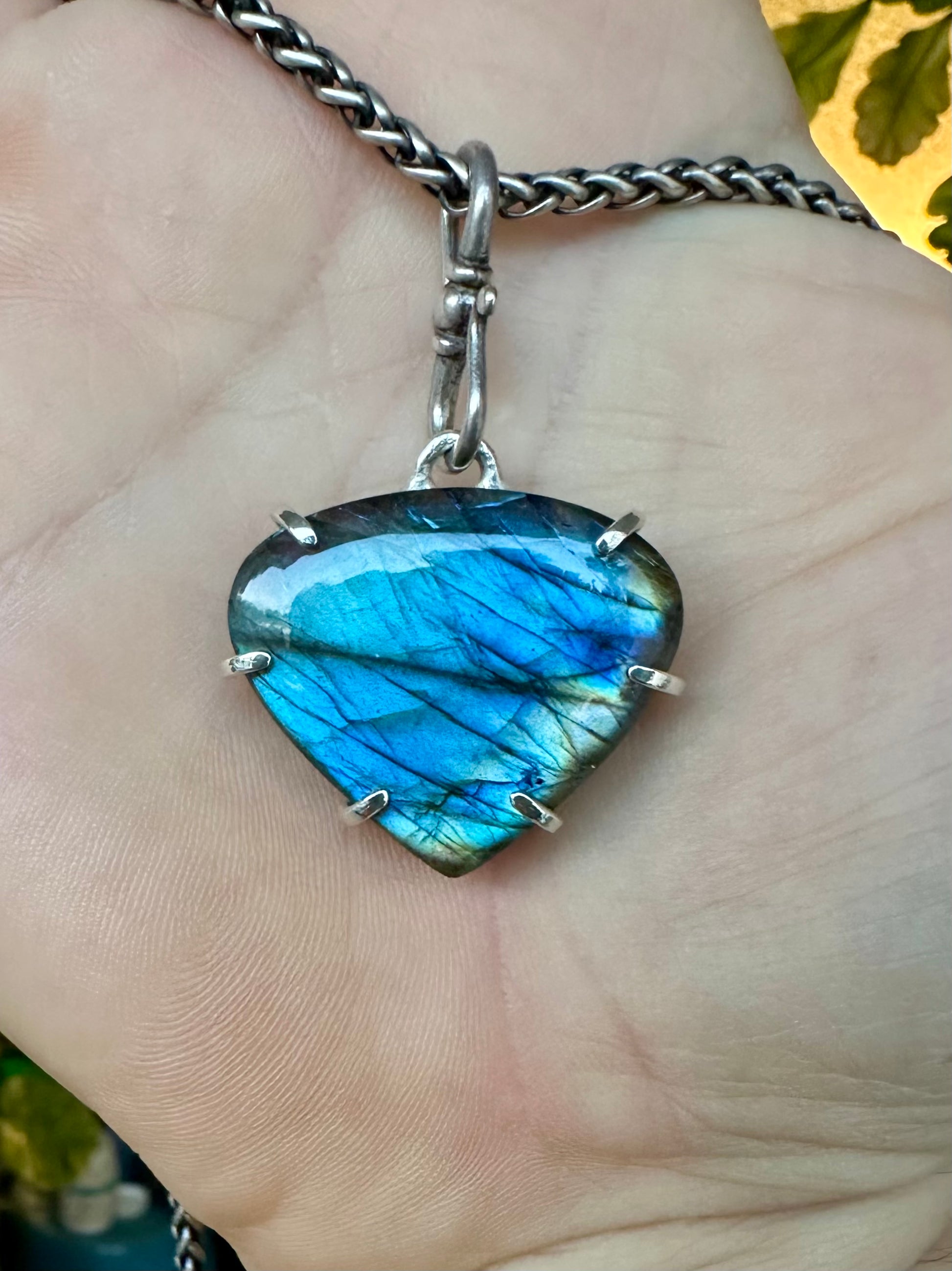 This pendant features a 28x26mm labradorite stone with beautiful blue flashes, set within a frame of argentium silver. Argentium silver is a special sterling silver alloy that includes germanium, making it more resistant to tarnishing. Please note, the chain is not included.